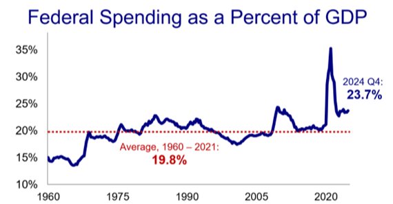 Federal spending spiked during the COVID-19 pandemic to 35% of GDP and, despite a considerable drop as  the pandemic subsided, the U.S. is currently spending 3.9 percentage points higher than our long-term average (going back to 1960). To reduce the budget deficit and get back to the pre-pandemic trend, the Trump administration and Republicans in Congress are focused on cutting spending. This ties into the work the Department of Government Efficiency (DOGE) is doing, efforts to reduce the federal workforce, and efforts to reduce spending across federal agencies.