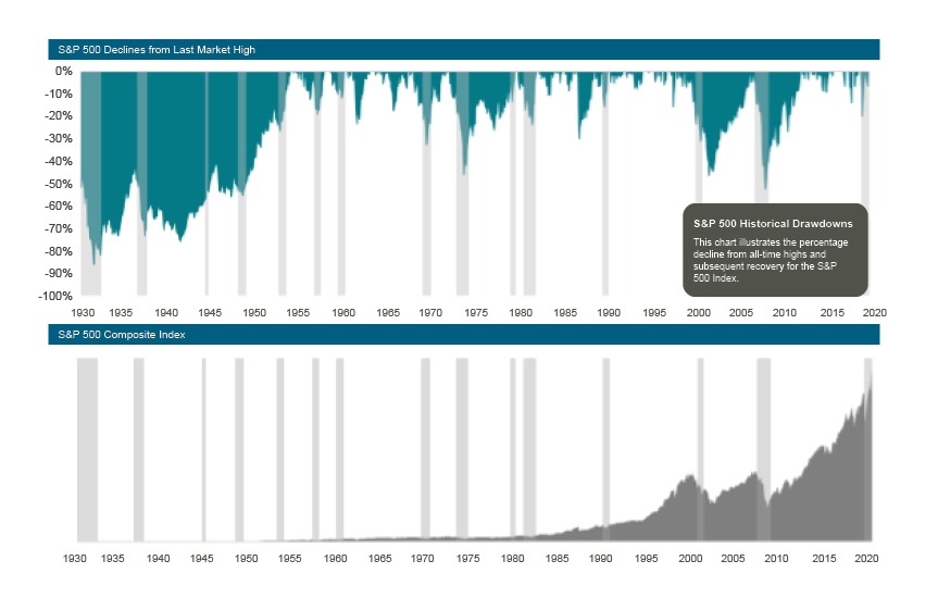 And it's not just the occasional correction that challenges investors’ mettle – crises have occurred like clockwork over the last century. In the image below, each gray bar represents a separate recession – a distinct period of negative growth, high unemployment and unique catalysts that fed the downturn (such as a housing crash, an oil embargo or rampant inflation). And it doesn’t take much imagination to understand how terrifying and fear-inducing the news headlines would have been during these crises, either. While the bottom half of the image shows how rewarding long-term investing can be, the top half shows just how hard it is to stay the course.