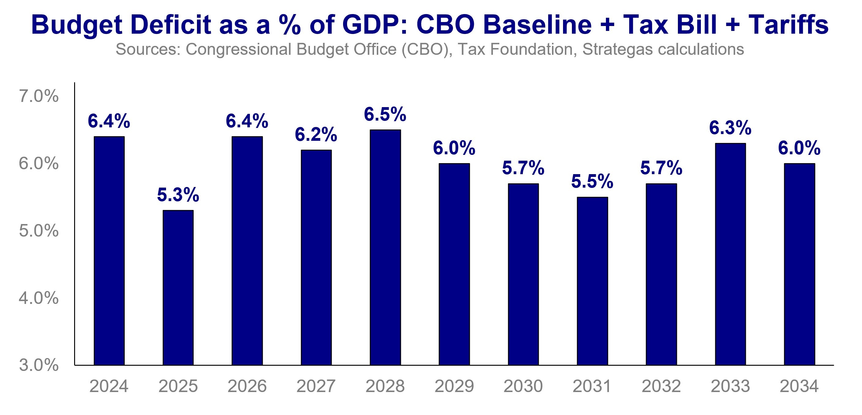 However, the CBO estimates seperately that tariffs imposed since the start of the year will provide an additional $2.5 trillion of tax revenue over 10 years. Hence, the CBO’s estimate is that the tariffs will pay for the tax cut extension passed by the House. Our estimate has been that the tariffs and the tax bill will equalize one another and not increase or decrease the deficit, similar to the CBO’s conclusion.
